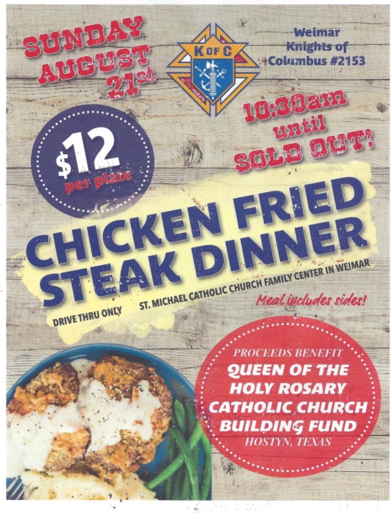 Chicken Fried Steak Dinner to benefit the Queen of the Holy Rosary Church in Hostyn Building Fund. Serving starts at 10:30 - UNTIL SOLD OUT.Images