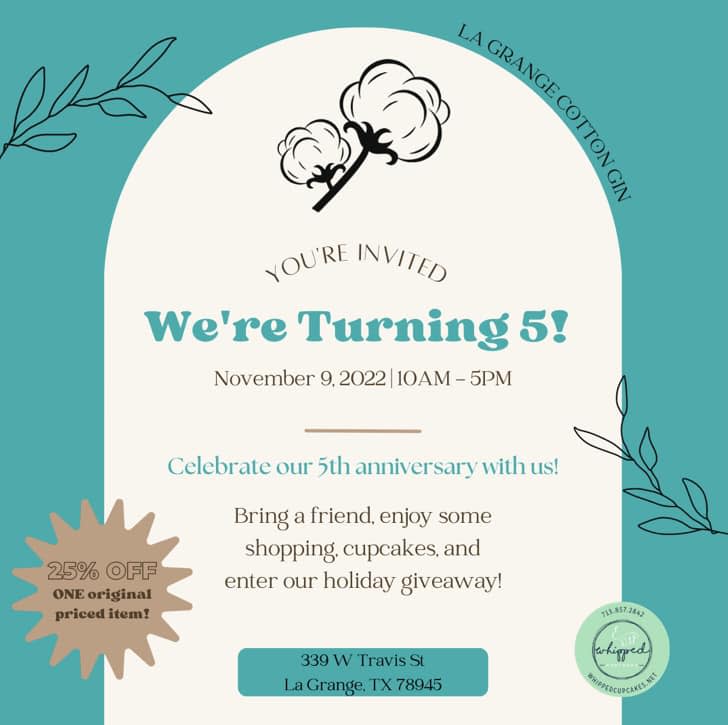 Come out and celebrate 5 years with La Grange Cotton Gin. Don't forget you get 25% off one item.Images